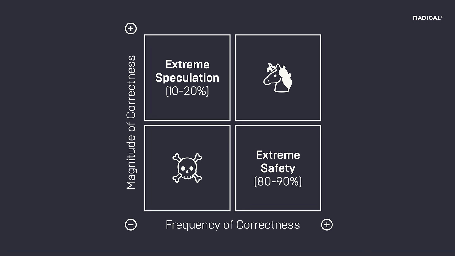 If you think about any (innovation) initiative, you can assess it on both an axis of its impact on your bottom line if you get it right (the “magnitude of correctness”) and the likelihood of getting it right (the “frequency of correctness”). I doubt any company and its leaders struggle with the idea that for bets in the “extreme safety” category, you need to get things right pretty much all of the time – and companies regularly do. It’s typically things they have been doing for a long time, incremental innovation, with lots of available market data to minimize risk. Where the struggle gets real is when companies embark on their “extreme speculation” journey – a fair number of companies never get there, as it’s too scary, too ambiguous, and too complex. But even those who try often fall for the illusion that you can (and should) be able to get outlandish returns with a high (or average) level of correctness.