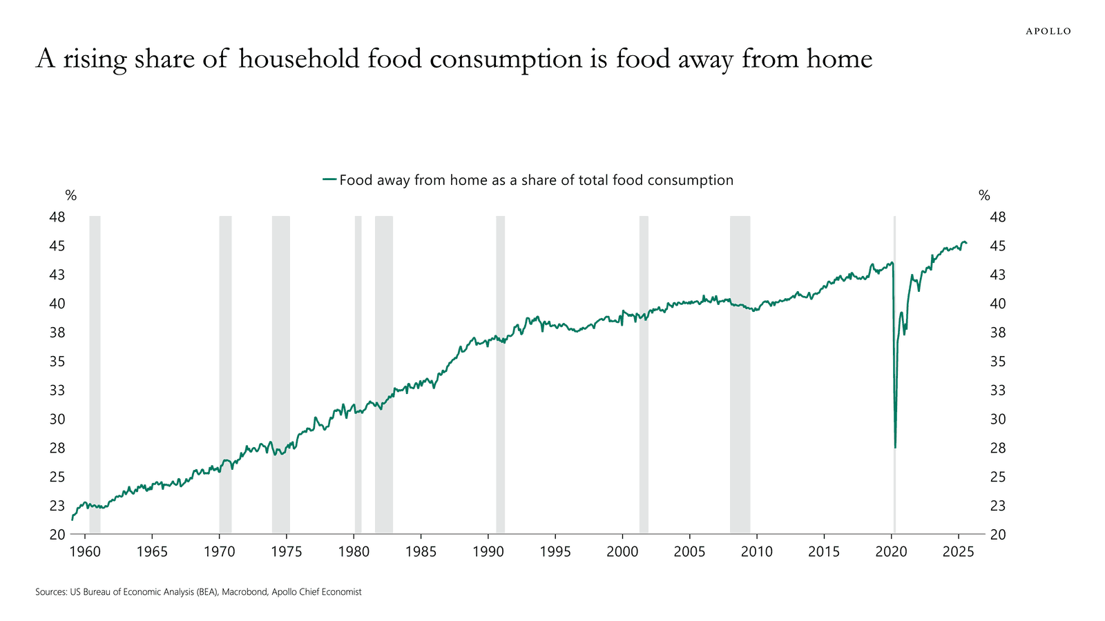 Home cooking has become a dying art form. Latest data from investment firm Apollo shows that more than 50% of U.S. households’ food consumption is away from home. This is good for restaurants and food delivery services, but bad for grocers (and, likely, your waistline). It makes you wonder how this might change with the sharp rise in GLP-1 drug intake (Ozempic and friends)?!